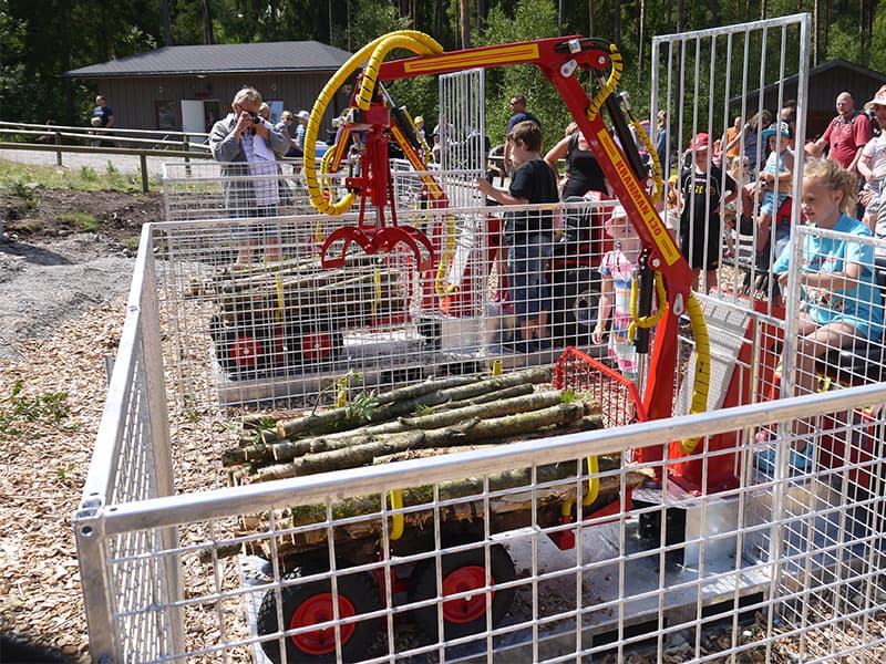 Som en del av Björnlekparken hittar du de populära skogsmaskinerna. Prova på att lasta stockar som en riktig skogsarbetare.